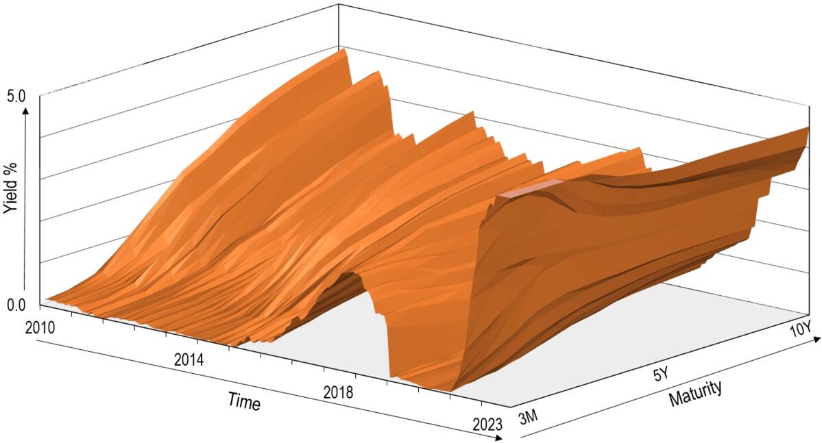 The fast and steep rise of interest rates in advanced economies over the last two years has surprised investors and economists reminding us of the need to approach yield curves' analysis with humility. Chart 1 shows the US yield curves since 2010 with the striking "tidal wave" profile of interest rates across all maturities, from short-term rates to the 10-year interest rate, beginning in 2022. Yield curves of other G10 countries follow similar patterns, with the exception of Japan, as the BoJ is keeping its short-term policy rate unchanged in negative territory.